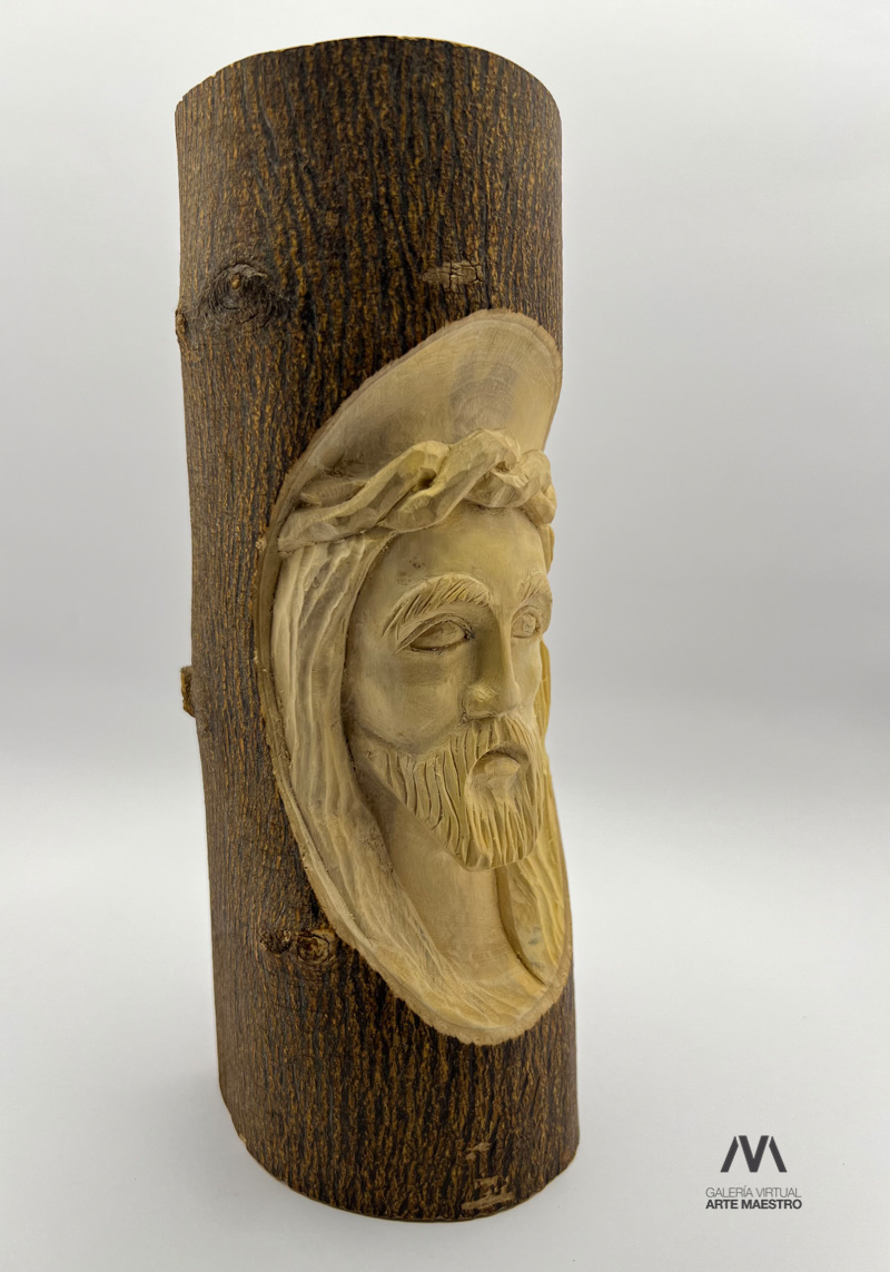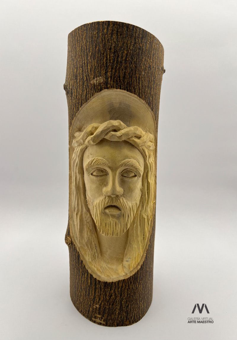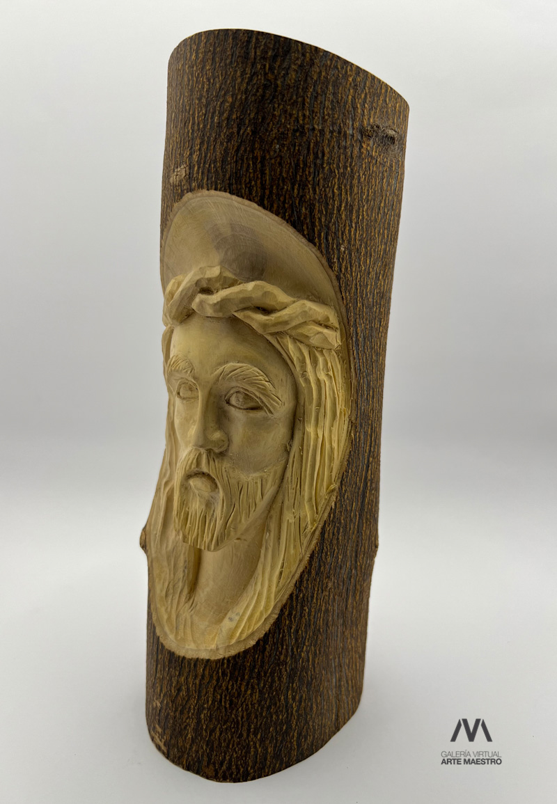 Cristo en tronco de naranjo es una obra tallada en bajo relieve al interior de un tronco creando una imagen que muestra el rostro de Cristo con una corona de espinas en una expresión de dolor y resignación.