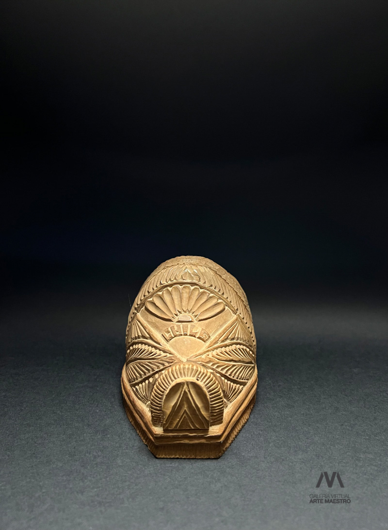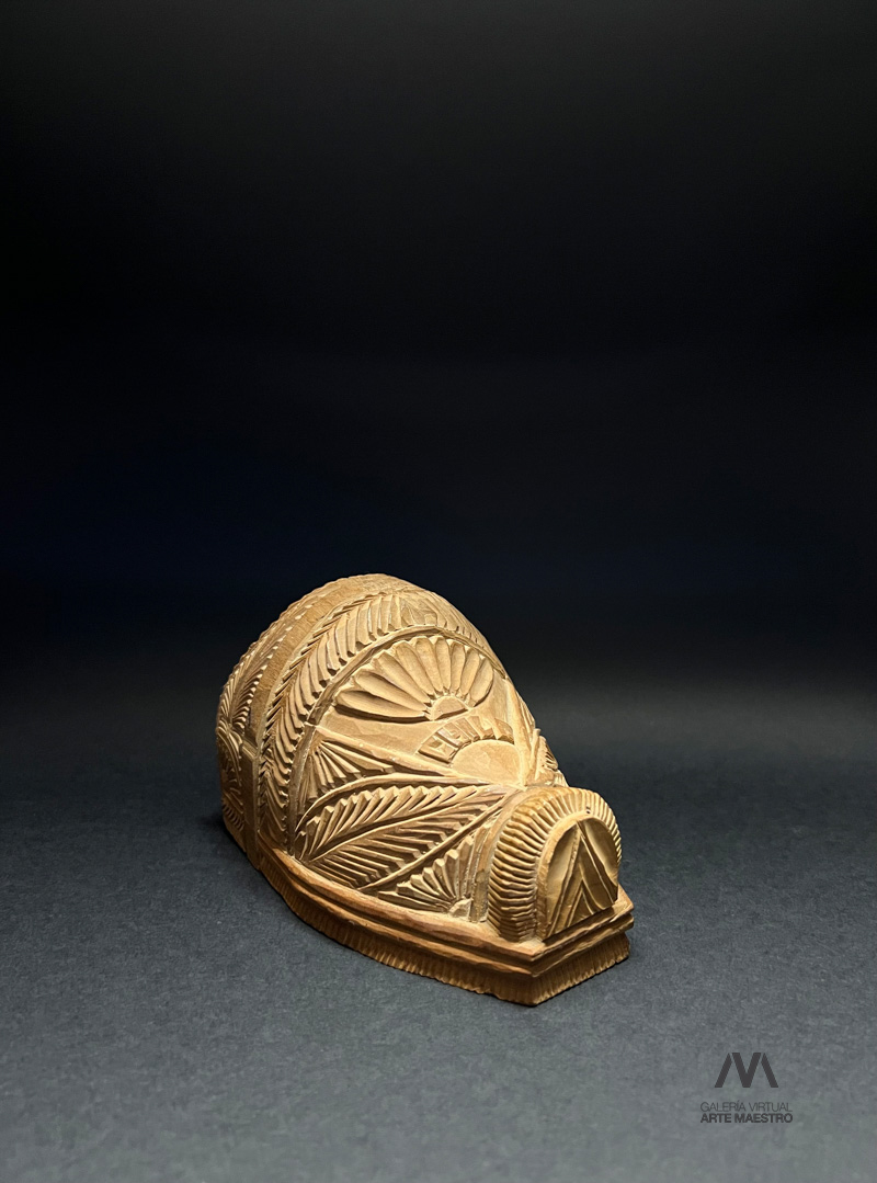 Estribo con detalles decorativos tallados en madera de raulí, que resaltan en la madera natural.